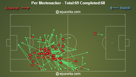 Mertesacker - 7 - Good tackle after a difficult ball into the box. A few important interceptions, but beyond that, the highlight was his obscene passing accuracy. The BFG misplaced 2 passes, while completing 71 of them.