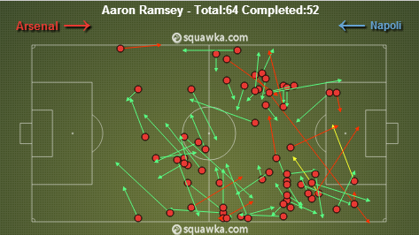 Ramsey - 8 - Undeniably the best form of his life and it showed. I am pretty sure there isn’t a blade of grass he didn’t cover, as this pass map shows. His assist came from the right wing, while performing a sensational tackle outside the left hand side of our box. The kid can do very little wrong right now.